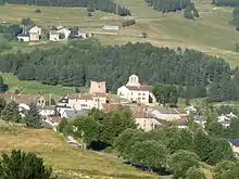 Vue aérienne du bourg principal de la Llagonne, en direction du sud. En arrière-plan, au centre droit, le Cambre d’Aze (2 711 m) ; vers la gauche, sur la frontière espagnole, le pic de les Nou Fonts (2 865 m). | |||||