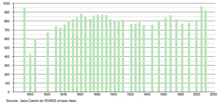 L'évolution du nombre d'habitants est connue à travers les recensements de la population effectués dans la commune depuis 1793. À partir du , les populations légales des communes sont publiées annuellement dans le cadre d'un recensement qui repose désormais sur une collecte d'information annuelle, concernant successivement tous les territoires communaux au cours d'une période de cinq ans. Pour les communes de moins de 10 000 habitants, une enquête de recensement portant sur toute la population est réalisée tous les cinq ans, les populations légales des années intermédiaires étant quant à elles estimées par interpolation ou extrapolation[13]. Pour la commune, le premier recensement exhaustif entrant dans le cadre du nouveau dispositif a été réalisé en 2005[14],[Note 1].