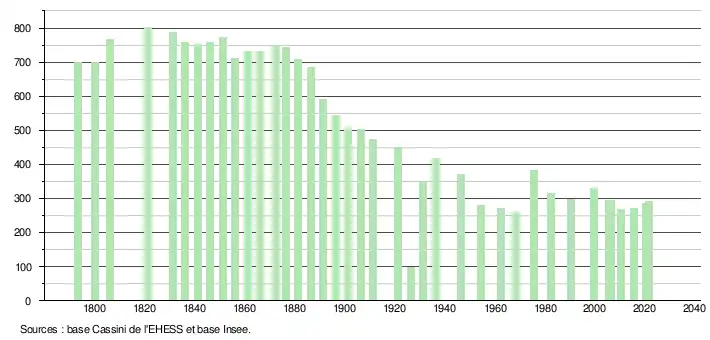 L'évolution du nombre d'habitants est connue à travers les recensements de la population effectués dans la commune depuis 1793. Pour les communes de moins de 10 000 habitants, une enquête de recensement portant sur toute la population est réalisée tous les cinq ans, les populations légales des années intermédiaires étant quant à elles estimées par interpolation ou extrapolation[24]. Pour la commune, le premier recensement exhaustif entrant dans le cadre du nouveau dispositif a été réalisé en 2005[25].