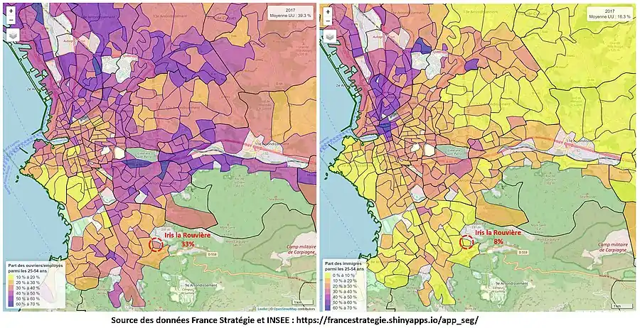 Les cartographies de la sociologie des quartiers de Marseille ci-dessous issus des travaux de France Stratégie et de l'INSEE mettent en évidence plusieurs faits sur la population du quartier iris de la Rouvière :