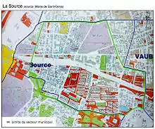 Actuellement d'une superficie de 112 ha[3], le découpage municipal limite le secteur de La Source au nord par la rue du Général de Gaulle, à l'ouest par les rues Ruisseaux des Noirs et le Boulevard de la Providence, au sud par le Boulevard de La Source et à l'est par l'hôpital de Bellepierre puis la falaise qui borde le quartier du bas de La Rivière.