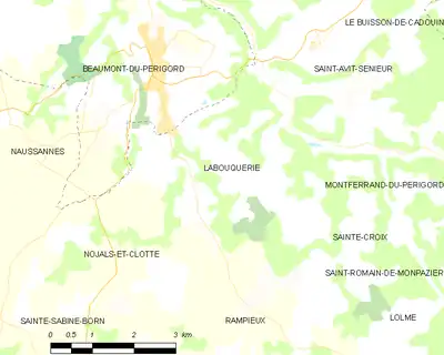 En 2015, année précédant la création de la commune nouvelle de Beaumontois en Périgord, Labouquerie était limitrophe de cinq autres communes.