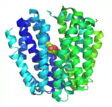 La structure de la lactose perméase d'E. coli a été publiée en 2003 par J. Abramson et al.[2]. Cette protéine est constituée de douze hélices transmembranaires et présente une symétrie d'ordre 2 entre les six hélices N-terminales et les six hélices C-terminales.