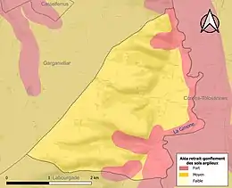 Le retrait-gonflement des sols argileux est susceptible d'engendrer des dommages importants aux bâtiments en cas d’alternance de périodes de sécheresse et de pluie. La totalité de la commune est en aléa moyen ou fort (92 % au niveau départemental et 48,5 % au niveau national). Sur les 105 bâtiments dénombrés sur la commune en 2019, 105 sont en aléa moyen ou fort, soit 100 %, à comparer aux 96 % au niveau départemental et 54 % au niveau national. Une cartographie de l'exposition du territoire national au retrait gonflement des sols argileux est disponible sur le site du BRGM[23],[Carte 3].
