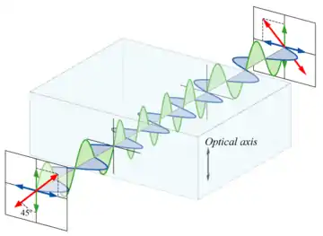 Cet effet vient de la biréfringence du cristal dans lequel est faite la lame (souvent du quartz ou du spath d'Islande) dont la forme est celle d'une lame à face parallèles[1]. En effet, un matériau biréfringent présente un axe privilégié appelé axe optique (c'est ainsi un matériau dit anisotrope). Or la polarisation de la lumière peut être décomposée en deux composantes : chaque composante ne se propage pas à la même vitesse selon qu'elle est parallèle ou perpendiculaire à l'axe optique (voir schéma ci-contre). Ceci permet de définir deux axes particuliers de la lame : l'axe lent et l'axe rapide.