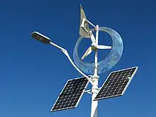 Un lampadaire hybride est un lampadaire autonome alimenté à la fois par l'énergie solaire et l'énergie éolienne, c'est-à-dire qu'il est équipé de panneaux solaires photovoltaïques et d'une petite éolienne. Ce type de lampadaire fournit un éclairage public totalement gratuit et entièrement écologique.