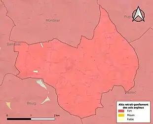 Le retrait-gonflement des sols argileux est susceptible d'engendrer des dommages importants aux bâtiments en cas d’alternance de périodes de sécheresse et de pluie. 99,8 % de la superficie communale est en aléa moyen ou fort (67,4 % au niveau départemental et 48,5 % au niveau national). Sur les 317 bâtiments dénombrés sur la commune en 2019, 317 sont en aléa moyen ou fort, soit 100 %, à comparer aux 84 % au niveau départemental et 54 % au niveau national. Une cartographie de l'exposition du territoire national au retrait gonflement des sols argileux est disponible sur le site du BRGM[17],[Carte 2].