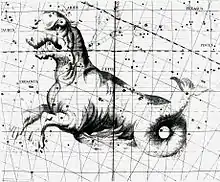 Le monstre à la couleur bleu-vert, ou brillant[154],[155], est une créature chimérique serpentiforme aquatique[ico 2],[ico 3]. Qualifié parfois de « chien de Triton[156] », vil serviteur des serviteurs, qui de Triton progéniture de Poséidon, mi-homme, mi-dauphin, n'en a même pas l'humanité partielle. Céto nous est dit vomir des vagues et, d'un triple flot déferlant, ébranle tout le sol à son passage[155]. Car c'est dans un bruit assourdissant qui vient de la mer, qui agite aussi bien les flots que le pesant mont Ida où les forêts denses s'entrechoquent, où les grottes résonnent, et qui fait aussi chanceler les tours de Troie, que l'animal, aussi grand qu'hideux aux grands et repoussants regards touffus d'épais ou épineux sourcils, surgi des tréfonds de la mer mugissante, porté par les ondes massives des vagues laissant difficilement deviner son long et affilé museau. S'affiche à l'air libre alors, de ce qui n'a été vraiment qu'encore que des yeux étincelants perçant les eaux, le monstre, écrasant de sa lourdeur la mer qui jaillit autour de ses flancs, parfois en écume ; ses dents acérées sur trois rangées sont alignées sur ses mâchoires qui se choquent l'une contre l'autre, certaines sont crochues pour retenir la proie, d'autres sont hautes et droites pour mieux la percer ; sa croupe squameuse finit par une queue qui se déroule puis revient sur elle-même et dont l'extrémité, voile éclatant, se dresse en hauteur ; et fièrement relève-t-il sa tête qui surmonte un long cou courbe, souple et agile comme le reste du corps qui dans ses multiples convexités, s'enfonce sous l'eau et ne transparaît à la vue qu'ici ou là à la surface, comme des îles déposées sur les flots les unes après les autres. Sa marche sinueuse et trépidante est tempête avant de finir par s'échouer sur le rivage[101],[153].