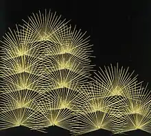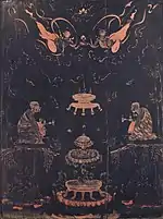 - maki-e (蒔絵) utilisant des poudres métalliques, y compris l'or, l'argent, le cuivre et leurs alliages, étalés avec des tubes de bambou ou des pinceaux fins. En hiramaki-e, les poudres sont déposées sur la laque humide pour être ensuite recouvertes d'une autre couche de laque. Takamaki-e réalise un effet de relief élevé par couches répétées, y compris parfois l'ajout de charbon de bois, de sciure ou d'argile[27]. Togidashi-e consiste à recouvrir le maki-e original de plusieurs couches de laque, puis à le polir jusqu'à ce que le dessin soit visible[38].