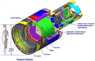 L'unique instrument située à l'extrémité de l'optique est une caméra d'une taille et d'une résolution exceptionnelle. Elle est conçue pour fournir en une seule prise une image d'une portion du ciel d'un diamètre de 3,5° (40 fois la taille de la Lune) avec une résolution spatiale de 0,2 seconde d'arc. Le capteur numérique d'un diamètre de 64 centimètres est constitué de 3,2 milliards de pixels de 10 microns de côté obtenus en juxtaposant 189 capteurs CCD au silicium de 16 mégapixels chacun[33]. Le capteur est sensible à une plage de longueurs d'onde qui va du proche ultraviolet au proche infrarouge en passant par le visible (0,1 à 1 micron). Pour obtenir les performances attendues, le capteur est refroidi par de l'azote qui est maintenu à une température de -100 °C. La caméra comporte trois lentilles en verre de silice (L1, L2, L3) qui sont chargées de supprimer les aberrations. L3 sert de barrière étanche à l'azote qui refroidit le capteur. Entre L3 et le capteur on trouve le filtre (75 centimètres de diamètre) qui permet de sélectionner une portion du spectre lumineux. Un carrousel comportant 5 filtres permet de le remplacer en quelques minutes. Un sixième filtre peut être placé manuellement. L'obturateur à lames placé après le filtre est conçu pour que chaque pixel soit éclairé durant la même durée. La caméra a une masse de 2,8 tonnes, un diamètre de 1,69 mètre et est longue de 3 mètres[34],[35],[36].