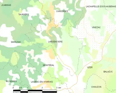 Largentière est limitrophe de six communes[1], toutes situées dans le département de l'Ardèche, et réparties géographiquement de la manière suivante :