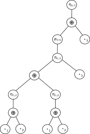 Dans l’exemple, le graphe final est obtenu par la jonction des trois sommets rouges et des deux sommets verts ; le graphe précédent est l’union disjointe des eux graphes bleu-rouge et vert-bleu, etc. La suite des graphes construits par les opérations est figurée dans l'arbre des opérations.