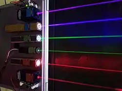 Un laser (acronyme issu de l'anglais light amplification by stimulated emission of radiation qui signifie « amplification de la lumière par émission stimulée de radiation ») est un système photonique. Il s'agit d'un appareil qui produit un rayonnement lumineux spatialement et temporellement cohérent reposant sur le processus d'émission stimulée. La lumière du laser est aussi appelée lumière cohérente. Descendant du maser[1], le laser s'est d'abord appelé « maser optique ».