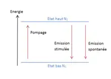 Dans le cas d'un modèle de transition entre 2 niveaux bas et haut, notés respectivement et , la population de l'état haut doit être supérieure à la population de l'état bas pour qu'il y ait émission : .