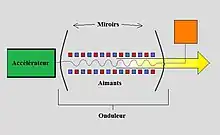 Les lasers à électrons libres ont un principe d'émission faisant intervenir des électrons non liés à un atome particulier. Ces électrons sont d'abord accélérés au sein d'accélérateurs de particules jusqu'à une énergie parfois supérieure à 15 GeV pour les plus grosses machines (la valeur varie en fonction de la longueur d'onde de la lumière que l'on veut produire), puis passent au travers d'un "onduleur", qui n'est autre qu'une série d'aimants dont les pôles sont inversés. Il s'ensuit une trajectoire en zigzag des électrons et l'émission d'un rayonnement synchrotron.