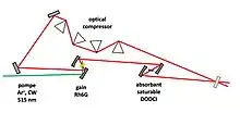 Malgré de nombreuses expériences de physique et de chimie réussies, réalisées à l'aide d'un laser à colorant CPM[9], il y avait clairement un fort besoin d'un moyen de réduire considérablement les fluctuations d'intensité du laser. Au cours de l'année 1982, le groupe de Jean-Claude Diels, à l'université de North Texas, a observé que les impulsions d'un CPM traversant une plaque de verre voyaient leur durée diminuer démontrant qu'une dispersion négative de fréquence se produisait à l'intérieur de la cavité. Afin de compenser cette dispersion de vitesse de groupe négative, ils ont introduit un prisme sur le trajet du faisceau à l'intérieur de la cavité annulaire pour pouvoir faire varier la longueur de verre traversée les impulsions. De cette façon, ils ont réussi à produire des impulsions de 60 fs, brisant ainsi le record précédent de 90 fs[10]. Il y avait à l'époque des réflexions sur le remplacement des réseaux d'un compresseur d'impulsions par des prismes, car les prismes, lorsque la lumière incidente sur leurs faces est à l'angle de Brewster, n'introduisent pas de pertes et peuvent donc, en principe être placés dans une cavité. Cependant, en l'absence de tout support théorique, il n'y avait aucune raison de croire qu'il pourrait y avoir une configuration d'un ensemble de prismes pouvant produire une dispersion négative nette en raison de leur dispersion positive intrinsèque.
