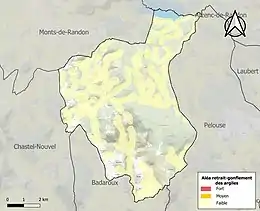 Le retrait-gonflement des sols argileux est susceptible d'engendrer des dommages importants aux bâtiments en cas d’alternance de périodes de sécheresse et de pluie. Aucune partie du territoire de la commune n'est en aléa moyen ou fort (15,8 % au niveau départemental et 48,5 % au niveau national). Sur les 125 bâtiments dénombrés sur la commune en 2019, aucun n'est en aléa moyen ou fort, à comparer aux 14 % au niveau départemental et 54 % au niveau national. Une cartographie de l'exposition du territoire national au retrait gonflement des sols argileux est disponible sur le site du BRGM[22],[Carte 2].