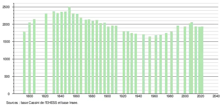 L'évolution du nombre d'habitants est connue à travers les recensements de la population effectués dans la commune depuis 1793. Pour les communes de moins de 10 000 habitants, une enquête de recensement portant sur toute la population est réalisée tous les cinq ans, les populations légales des années intermédiaires étant quant à elles estimées par interpolation ou extrapolation[22]. Pour la commune, le premier recensement exhaustif entrant dans le cadre du nouveau dispositif a été réalisé en 2008[23].