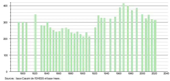 L'évolution du nombre d'habitants est connue à travers les recensements de la population effectués dans la commune depuis 1793. Pour les communes de moins de 10 000 habitants, une enquête de recensement portant sur toute la population est réalisée tous les cinq ans, les populations légales des années intermédiaires étant quant à elles estimées par interpolation ou extrapolation[25]. Pour la commune, le premier recensement exhaustif entrant dans le cadre du nouveau dispositif a été réalisé en 2005[26].