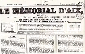 Le premier numéro du Mémorial d'Aix paraît le et est publié par l'imprimerie Remondet-Aubin, sur le cours Mirabeau (hôtel du Poët[2]). Il porte alors le sous-titre : « Journal historique, judiciaire, scientifique et commercial »[3]. Ce sous-titre deviendra « Journal politique, littéraire, administratif, judiciaire, commercial et agricole » à partir de 1847. L'un de ses plus influents directeurs sera Jean-Baptiste Gaut[4] (1819-1891), aussi connu sous le nom de « félibre Gaut ».