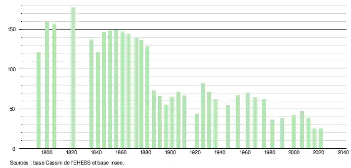 L'évolution du nombre d'habitants est connue à travers les recensements de la population effectués dans la commune depuis 1793. Pour les communes de moins de 10 000 habitants, une enquête de recensement portant sur toute la population est réalisée tous les cinq ans, les populations légales des années intermédiaires étant quant à elles estimées par interpolation ou extrapolation[21]. Pour la commune, le premier recensement exhaustif entrant dans le cadre du nouveau dispositif a été réalisé en 2006[22].
