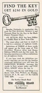 La première du film a lieu le , simultanément[204] au cinéma Tivoli de Londres, en présence de Robert Fairbanks, de têtes couronnées et de « critiques parisiens proéminents »[205],[206],[207], et à New York au théâtre Selwyn, en présence de Doug, de Mary et, à l'extérieur, d'une foule que la police contient difficilement[208],[209],[210],[211]. Cette première new yorkaise est préune campagne promotionnelle constituée notamment d'une chasse au trésor, organisée avec le quotidien The Evening World[212],[168] et d'une diffusion radiophonique de la musique d'accompagnement du film, accompagnée d'une interview de Fairbanks[213]. La mise en scène de la première diffusion au Selwyn, introduite par une interprétation de la chanson Quinze Marins suivie de l'invitation par une voix sépulcrale à se transporter en pensée au temps des pirates, est relevée par le critique Mordaunt Hall (en) dans le New York Times[214] et l'économiste William J. Reilly (en) dans le Moving Picture World[215].