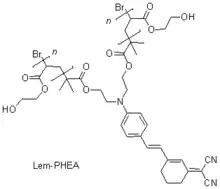 Le Lem-PHEA est un colorant dont la fluorescence résulte d'un transfert de charge intramoléculaire[2]. La suite de fragments -CH2CH-COO-CH2CH2OH résultant de l'oligomérisation lui confère une bonne solubilité dans l'eau. Il donne une absorption à deux photons, ce qui est une propriété incontournable pour faire de la spectroscopie avec résolution spatiale, afin d'être utilisé pour l'imagerie 3D. Ce colorant n'est pas toxique chez la souris[1],[3].