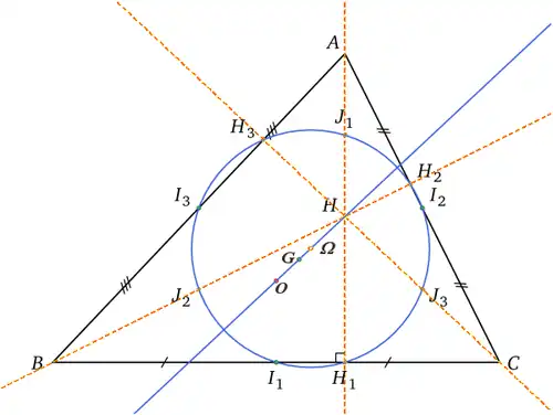 - les milieux de chacun des segments reliant l'orthocentre aux sommets du triangle (J1, J2 et J3 dans le diagramme),