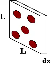 On considère un faisceau de particules projetées vers une cible, ainsi qu'une tranche infinitésimale de cette cible (Figure 1). Les atomes (ou autres particules) susceptibles d'arrêter des particules du faisceau sont en rouge. La grandeur du libre parcours moyen dépend des caractéristiques du système auquel la particule appartient :