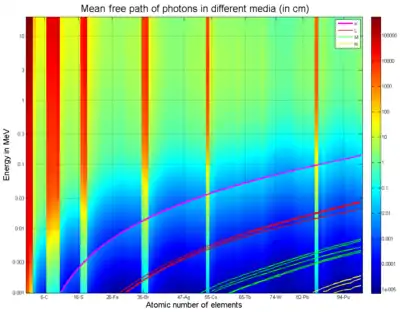 où est le coefficient d'absorption, est le coefficient d'absorption massique et la masse volumique du matériau. Le coefficient d'absorption massique peut être récupéré ou calculé pour un certain matériau et une énergie donnée à partir des bases de données du NIST [5],[6]