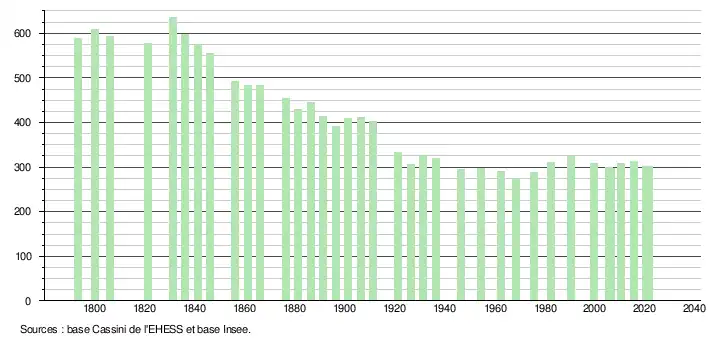 L'évolution du nombre d'habitants est connue à travers les recensements de la population effectués dans la commune depuis 1793. Pour les communes de moins de 10 000 habitants, une enquête de recensement portant sur toute la population est réalisée tous les cinq ans, les populations légales des années intermédiaires étant quant à elles estimées par interpolation ou extrapolation[15]. Pour la commune, le premier recensement exhaustif entrant dans le cadre du nouveau dispositif a été réalisé en 2005[16].