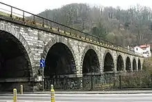 - Au lendemain de la guerre, le pont de fer, dynamité[2], fut reconstruit en pierre et prévu pour la double voie, qui ne vit jamais le jour. L'espace dévolu à la seconde voie fait aujourd'hui office de chemin pédestre.