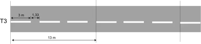 Les lignes de dissuasion de type T3 sont constituées de marques blanches de longueur 3 mètres et de largeur 2u, espacées de vides de longueur 1,33 m.