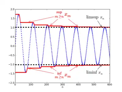 (La finitude de lim sup — ou de lim inf — pour une suite bornée fournit donc une preuve sophistiquée d'un cas particulier — par ailleurs élémentaire — du théorème de Bolzano-Weierstrass.)