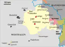 - Le comté de Lippe, comprenant les bailliages de Detmold, Oerlinghausen, Schötmar (aujourd'hui, partie de Bad Salzuflen), Horn (aujourd'hui, partie de Horn-Bad Meinberg), Varenholz (aujourd'hui, partie de Kalletal), Brake (aujourd'hui, partie de Lemgo), Barntrup et Lipperode ;