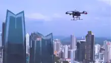Un drone de livraison volant devant des gratte-ciel à Panama.