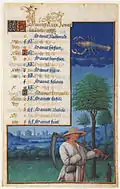 Mois de juin | Free Library of Philadelphia, Lewis E. M. 11.20 | En juin, un paysan légèrement vêtu, une faux sur l'épaule, va aux champs. Le paysage d'une verdure luxuriante suggère l'air chaud du printemps finissant. Le symbole astrologique est le cancer. Les jours sont marqués alternativement en bleu et en jaune. Saint Barnabé est noté en lettres rouges dans le calendrier. |