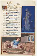 Mois de septembre | Free Library of Philadelphia, Lewis E. M. 11.22 | Le symbole astrologique est la balance. Les vendanges terminées, on presse les grappes dans de grands baquets. L'ouvrier est enfoncé dans les raisins largement au-dessus des genoux. Les tonneaux s'alignent sur le côté. Du jus de raisin s'écoule de leurs ouvertures.