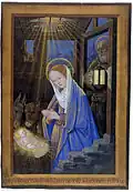Nativité | Victoria and Albert Museum, Cote E. 949-20003. | Heures de la Vierge (prime). Bourdichon, qui a une prédilection pour les scènes nocturnes et le jeu de lumière, donne ici libre cours à son imagination, et emploie trois sources de lumières: l'étoile de Bethléem, invisible, répond au rayonnement de l'Enfant, et illumine les vêtements de la Vierge, les faces du bœuf et de l'âne et des bergers. À droite, Joseph tient une lanterne, dont la lumière se répand sur la robe de la Vierge[27]. |
