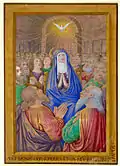 Pentecôte | British Library, manuscrit Add. 35254 fol. U. | Ouvre les Heures du Saint-Esprit. Bourdichon invite le spectateur dans la scène en lui offrant un vue par-dessus les épaules de deux disciples. Ceux-ci sont représentés en mi-corps, comme habituel chez Bourdichon. Placés bas dans le cadre, ils ouvrent la scène au spectateur. |