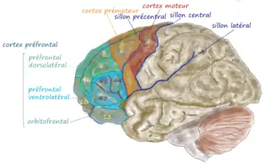 - le cortex préfrontal qui regroupe toutes les autres régions du lobe frontal. La forme et la position des gyrus et sillons du cortex préfrontal n'ont que peu de rapport avec leur structure architectonique.
