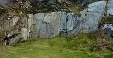 Pétrographiquement, la « pierre de Locquirec » est une roche volcano-sédimentaire correspondant à des tuffites chloriteuses grossières qui donnent des lauzes, pierres naguère très recherchées mais désormais uniquement utilisées en matériau de récupération[15]. L'orthogneiss monzogranitique du Moulin-de-la-Rive donne des affleurements le long de la falaise côtière et sur l'estran marin depuis la grève de Poul Rodou jusqu'à la pointe du Corbeau. Témoins de la chaîne icartienne, ces gneiss mylonitisés constituent un soubassement sur lequel se dépose la formation volcano-sédimentaire briovérienne de Locquirec[16].