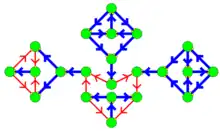 La figure ci-contre représente un sommet d'un graphe contraint. On suppose son flot entrant minimal est 2. Les deux arcs rouges pondérés par 1 représentent les deux entrées de la porte. L'un des arcs représente la valeur vraie s'il est dirigé vers le sommet, et faux sinon. L'arc bleu est pondéré par 2 et représente la sortie de la porte. Il est vrai s'il est sortant. La table suivante donne la table de vérité d'un ET et l'interprétation sur la porte ET dans un graphe contraint :