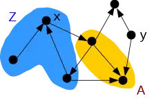 MSO a été défini sur des classes de graphes (par exemple, non orientés). Par exemple, on peut exprimer en MSO qu'un graphe n'est pas connexe[3] : qui se lit « il existe un ensemble de sommets Z tel qu'il existe un sommet x contenu dans Z et un sommet y en dehors de Z et tel que si deux sommets u et v sont reliés par une arête, alors u est dans Z si et seulement si v est dans Z » (voir figure à droite). La connexité n'est pas définissable en logique du premier ordre (c'est une conséquence du théorème de compacité de la logique du premier ordre[4]). Ainsi MSO est strictement plus expressive que la logique du premier ordre sur les graphes.