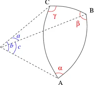 Dans un triangle sphérique ABC (Fig. 9), les dimensions réduites a, b et c correspondent à la mesure angulaire des segments de grand arc [BC], [AC] et [AB] et la loi des cosinus s'écrit[17] :