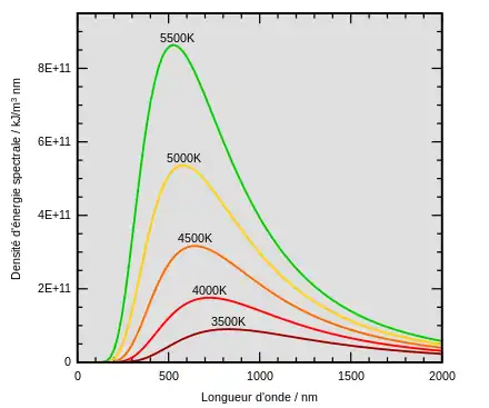 La distribution de luminance énergétique spectrale du corps noir est donnée en fonction de la longueur d'onde par la loi de Planck :