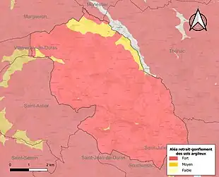 Le retrait-gonflement des sols argileux est susceptible d'engendrer des dommages importants aux bâtiments en cas d’alternance de périodes de sécheresse et de pluie[19]. La totalité de la commune est en aléa moyen ou fort (91,8 % au niveau départemental et 48,5 % au niveau national)[Carte 2]. Depuis le , en application de la loi ELAN, différentes contraintes s'imposent aux vendeurs, maîtres d'ouvrages ou constructeurs de biens situés dans une zone classée en aléa moyen ou fort[Note 2],[20].