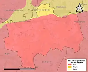 Le retrait-gonflement des sols argileux est susceptible d'engendrer des dommages importants aux bâtiments en cas d’alternance de périodes de sécheresse et de pluie. La totalité de la commune est en aléa moyen ou fort (67,4 % au niveau départemental et 48,5 % au niveau national). Sur les 141 bâtiments dénombrés sur la commune en 2019, 141 sont en aléa moyen ou fort, soit 100 %, à comparer aux 84 % au niveau départemental et 54 % au niveau national. Une cartographie de l'exposition du territoire national au retrait gonflement des sols argileux est disponible sur le site du BRGM[19],[Carte 2].