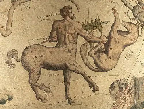 Les Grecs reprirent la figure mésopotamienne d’UR.IDIM = Uridimmû, « le Chien enragé » sous la forme de Θηρίον, la « Bête sauvage », comme cela est attesté chez Eudoxe de Cnide[5],»[6]. Mais cette figure ne fut pas tout de suite considérée comme une constellation indépendante mais comme un astérisme de la constellation de de Κένταυρος, le « Centaure », dans une liste comptant 44 constellations. On sait par Geminos de Rhodes (Ier siècle av. è. c.) qu’Hipparque (190-120) aurait détaché sous le nom de Λύκος, « le Loup », l’astérisme de la constellation de Κένταυρος, « 'le Centaure »[7], ce que fit à son tour Ptolémée, dans sa liste de 48 constellations, sous le nom de Θηρίον[8]. Pour Ératosthène, Κένταυρος n’est autre que Chiron, célèbre pour son sens de la justice et qui forma Asclépios et Achille. Mais il ne dit pas grand-chose de Θηρίον sauf que « Κένταυρος donne l’impression de l’apporter pour la sacrifier, geste qui symbolise on ne peut mieux sa piété »[9].