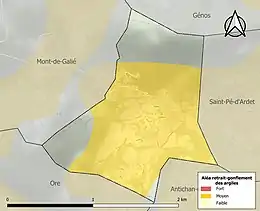 Le retrait-gonflement des sols argileux est susceptible d'engendrer des dommages importants aux bâtiments en cas d’alternance de périodes de sécheresse et de pluie. 69,8 % de la superficie communale est en aléa moyen ou fort (88,8 % au niveau départemental et 48,5 % au niveau national). Sur les 110 bâtiments dénombrés sur la commune en 2019, 110 sont en aléa moyen ou fort, soit 100 %, à comparer aux 98 % au niveau départemental et 54 % au niveau national. Une cartographie de l'exposition du territoire national au retrait gonflement des sols argileux est disponible sur le site du BRGM[30],[Carte 2].